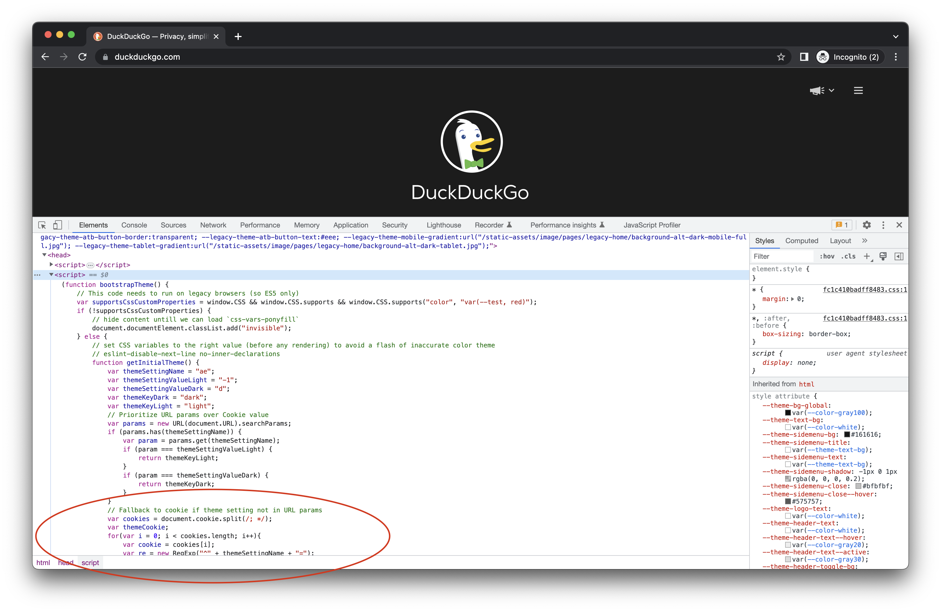duckduckgo.com engineers use an inline script with a cookie fallback: